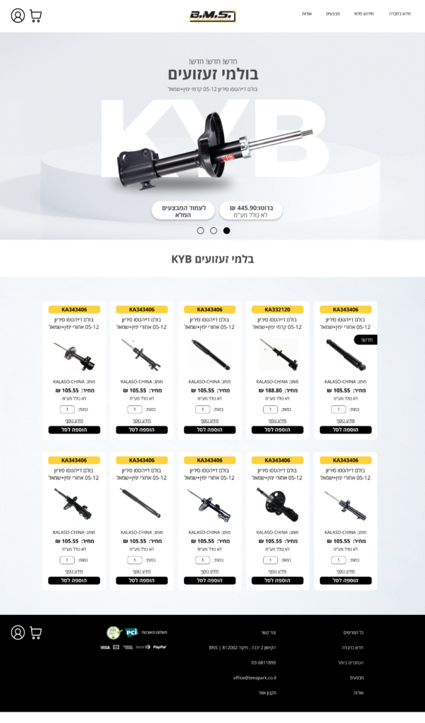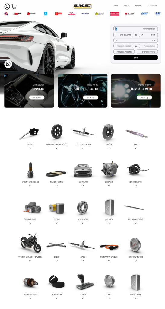 האתר החדש של B.M.S מציע חוויית משתמש עדכנית, ממוקדת ומהירה: המשתמש מזין את פרטי הרכב – והמערכת שולפת את כל החלפים הרלוונטיים בצורה גרידית, קריאה, ונוחה לרכישה. הממשק בנוי בצורה מינימליסטית אך מהודקת, עם מיתוג ברור, ניווט קל ותצוגת פריטים חכמה. התוצאה היא אתר שנראה מקצועי, עובד מהר, ומאפשר ללקוח להגיע בדיוק לחלפים שהוא צריך – בלי לבזבז זמן או להתבלבל.